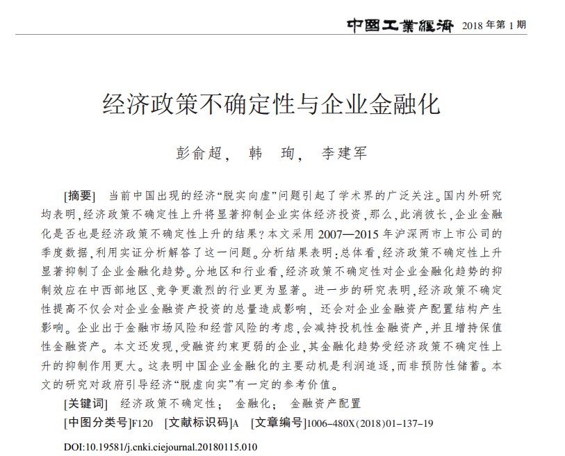 彭俞超、李建军:《经济政策不确定性与企业金融化》