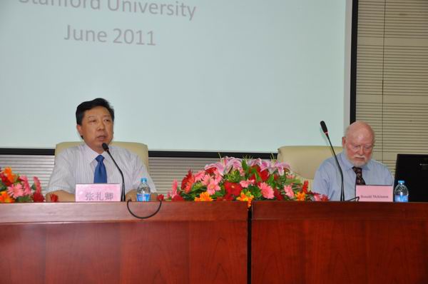 2011 年 6 月 27 日下午,公司第四十五期经济与金融学名家论坛在学术会堂 202 报告厅如期举行。世界著名经济学家、美国斯坦福大学教授、best365足球官网名誉教授罗纳德.麦金农教授为广大师生带来了题为“应该如何看待人民币汇率对全球经济稳定的影响”的学术讲座。公司经理张礼卿教授主持了讲座。