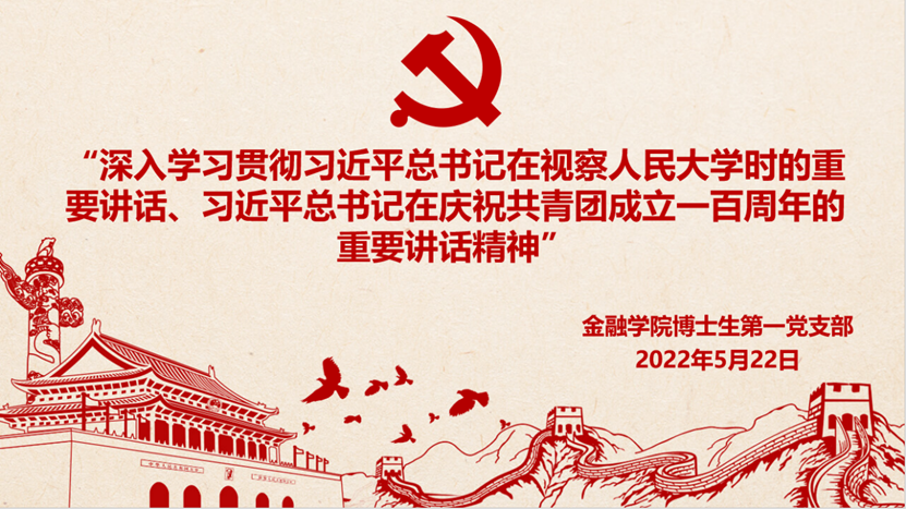 为深入学习贯彻习近平总书记在视察人民大学时的重要讲话、习近平总书记在庆祝共青团成立一百周年的重要讲话精神。博士生第一党支部于2022年5月22日晚上7点半召开主题党日学习活动。32名党员参加学习,会议由支部书记赵志桦同志主持,党支部入党积极分子王瑶列席会议。