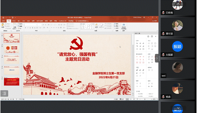 为深化党史学习教育,引导广大毕业研究生党员发扬红色传统,传承红色基因,赓续红色血脉,增强“四个意识”,坚定“四个自信”,做到“两个维护”,博士生第一党支部于2022年6月21日晚上7:30召开“请党放心,强国有我”主题党日学习活动。会议由支部书记赵志桦同志主持,34名党员参加学习,博士生宣讲团成员、best365足球官网博士生第二党支部宣传委员张文雅同志出席会议并做党课分享。