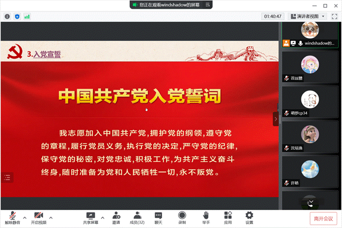 在重温入党誓词环节,考虑到以线上形式召开支部大会,因此支部以观看入党誓词记录片的形式,加强党员对于入党誓词的认识与理解。