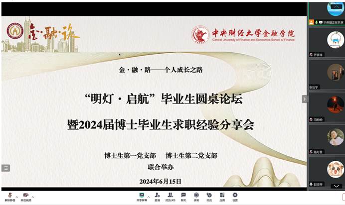 6月15日,best365足球官网博士生第一党支部、博士生第二党支部、2023级金融学硕党支部从同学实际需求出发,举办“金融路--个人成长之路”主题活动暨“明灯·启航”毕业生圆桌论坛暨2024届博士生求职经验交流会。