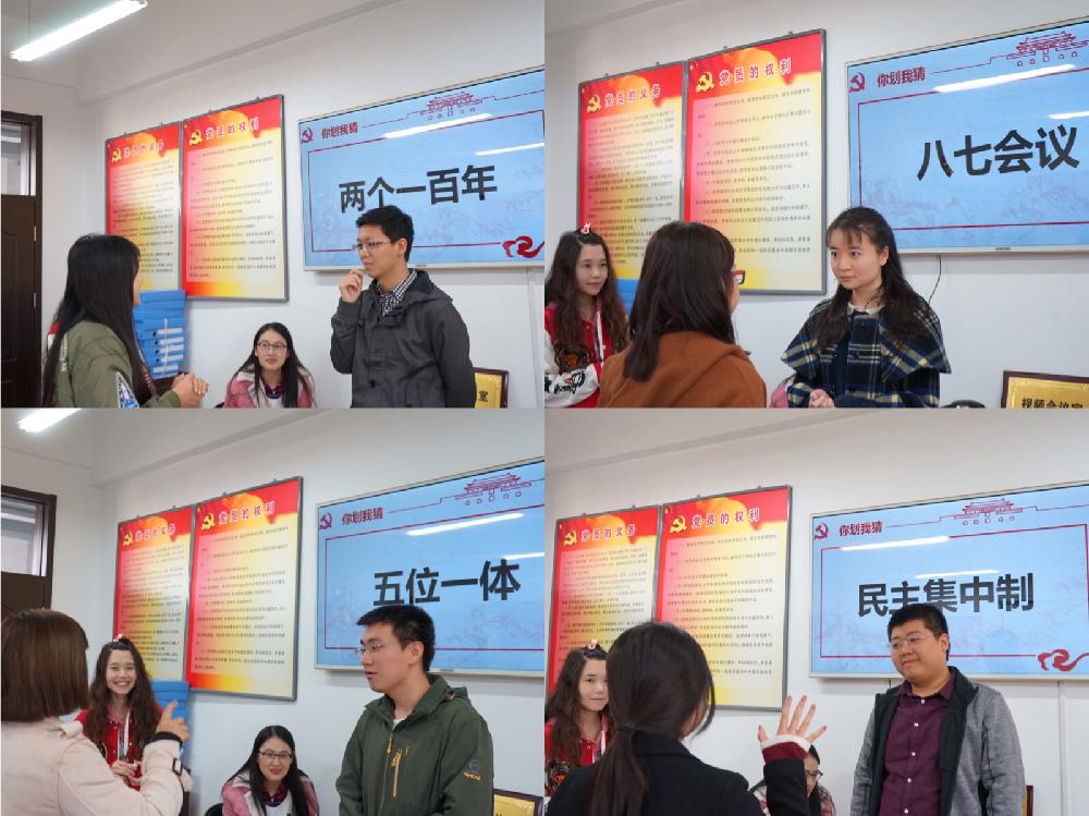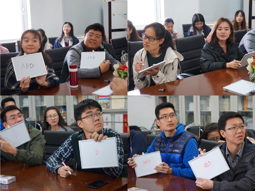 此次活动以团队PK形式进行,支部共计4支代表队20名党员积极分子参与比赛,支部宣传委员岳媛同学担任活动主持人。比赛分为两个环节,分别是“步步为营”和“你划我猜”。第一环节为“步步为营”,每支队伍轮流派一名队员上前答题,包括单选题、多选题,共计四组;第二环节为“你划我猜”,每支队伍轮流派两名队员上台比赛,一名队员看题板指示进行描述,另一队员根据对方的描述进行猜词。
