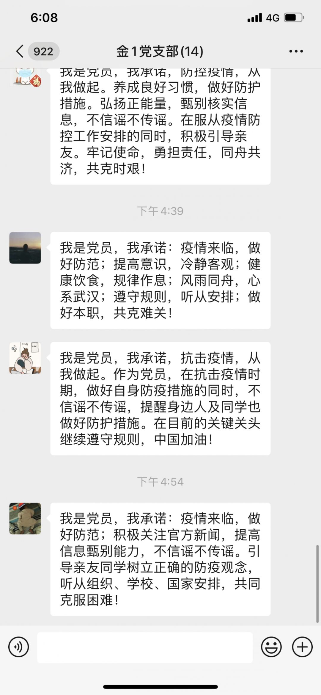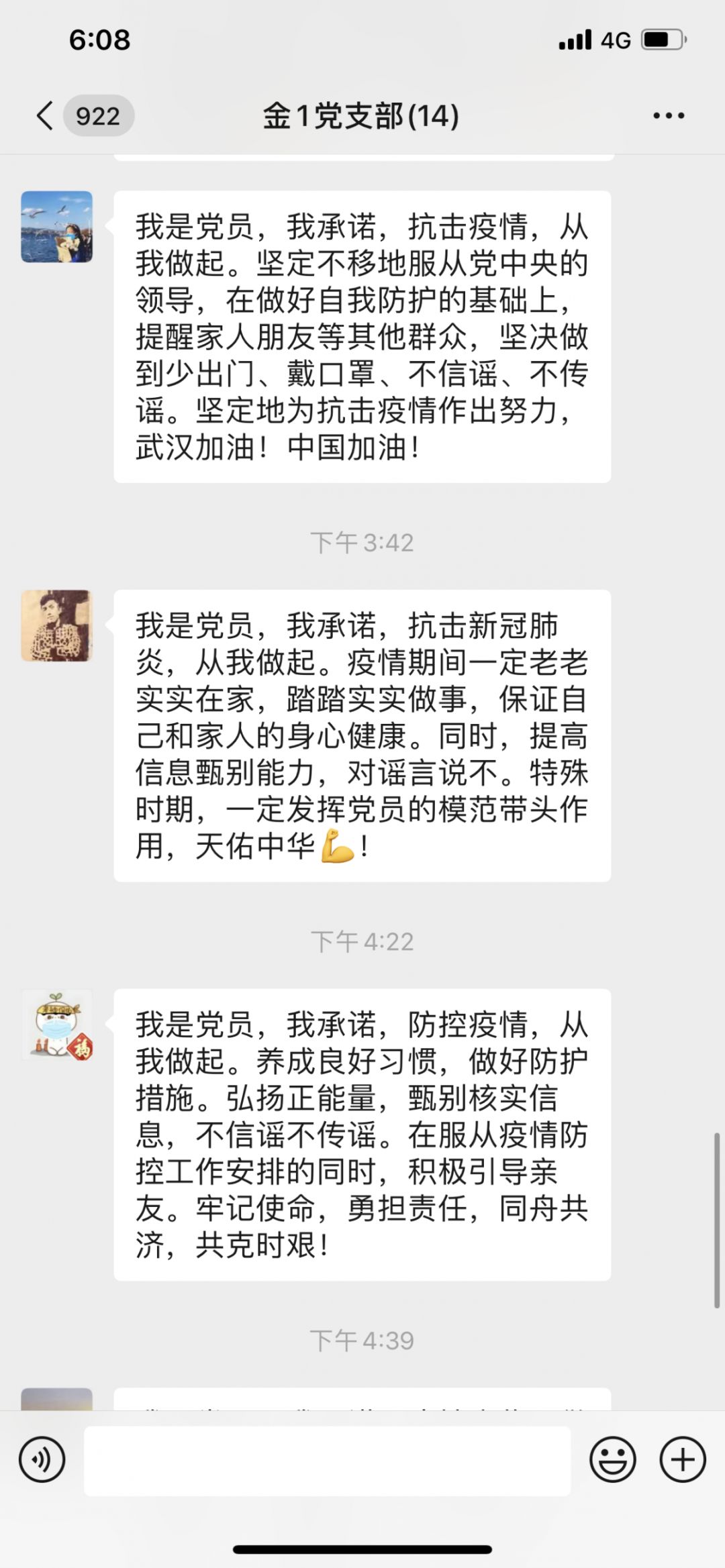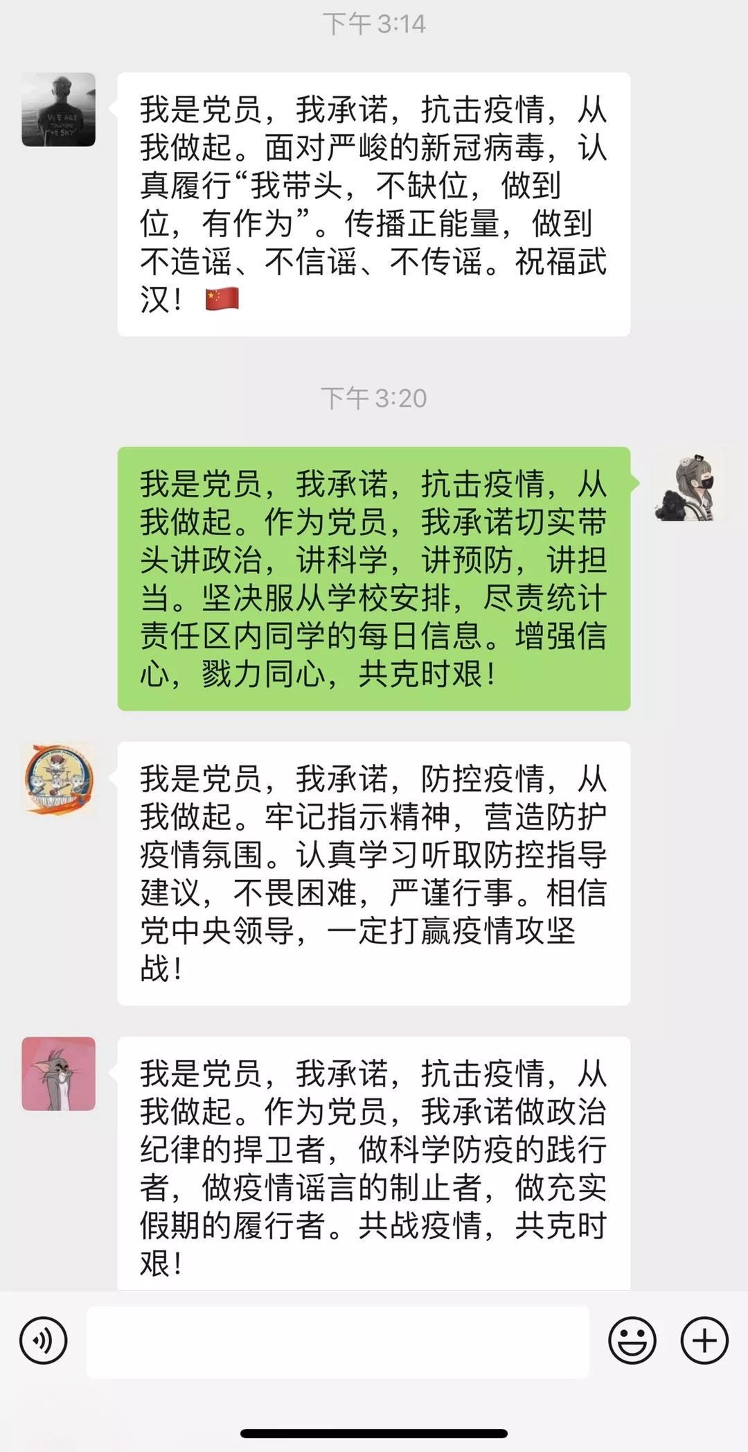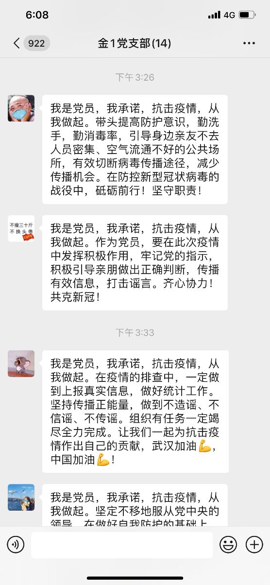 支部组织委员陈馨同志承诺:我是党员,我承诺,抗击疫情,从我做起。在疫情的排查中,一定做到上报真实信息,做好统计工作。坚持传播正能量,做到不造谣、不信谣、不传谣。组织有任务一定竭尽全力完成。让我们一起为抗击疫情作出自己的贡献,武汉加油,中国加油!