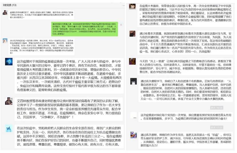 2020年3月9日下午14:30-16:30,best365足球官网2019级研究生第四党支部举办了以“疫情防控”为主题的主题党日活动,所有成员共同观看了“全国老员工同上一堂疫情防控思政大课”直播,并在直播结束后于微信群开展了学习和交流活动。本次“思政大课”特别邀请艾四林、秦宣、王炳林、冯秀军4位教授,结合“马克思主义基本原理概论”“毛泽东思想和中国特色社会主义理论体系概论”“中国近现代史纲要”“思想道德修养与法律基础”4门必修课教学内容,解读党中央关于疫情防控的决策部署,分析中国抗疫彰显的中国共产党领导和中国特色社会主义制度的显著优势,讲述防疫抗疫一线的感人故事。