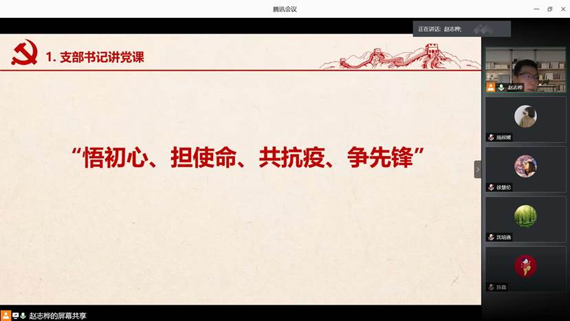 会议开始,支部书记赵志桦同志传达了支部获评“党建工作样板党支部”相关表彰情况,并对现阶段支部党员队伍结构情况进行了简单的介绍。紧接着,赵志桦同志就6月29日,党中央政治局集体学习会议上有关组织路线的会议精神作了相关回顾,并引出此次党课“悟初心,担使命,共抗疫,争先锋”的主题。