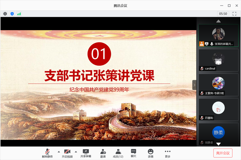 2020年7月1日,best365足球官网2019级研究生第四党支部在线开展了庆祝中国共产党建党99周年主题教育系列活动之“迎党的生日、讲战疫故事、悟初心使命”讲党课及主题党日活动。