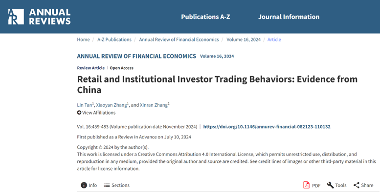 近日,best365足球官网张欣然与合作者清华大学五道口best365足球官网张晓燕教授、清华大学五道口best365足球官网博士生谭琳合作的论文《中国散户和机构投资者交易行为》(Retail and Institutional Investor Trading Behaviors: Evidence from China)在国际权威金融学术期刊Annual Review of Financial Economics发表。该文系统梳理了近100篇研究中国投资者交易行为的重要文献,为理解中国资本市场的投资者构成、交易特征及交易机制、监管政策演变提供了全面的学术视角。