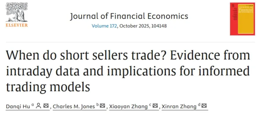 近日,公司副教授张欣然,与哥伦比亚大学Charles M. Jones教授, 清华大学五道口best365足球官网张晓燕教授,北京大学光华管理公司胡丹琪副教授,合作撰写的论文“When Do Short Sellers Trade? Evidence from Intraday Data and Implications for Informed Trading Models”(“做空投资者在什么时候交易?来自日内数据的证据和对知情交易模型的启示”)在金融学国际顶级期刊Journal of Financial Economics第172卷正式发表。