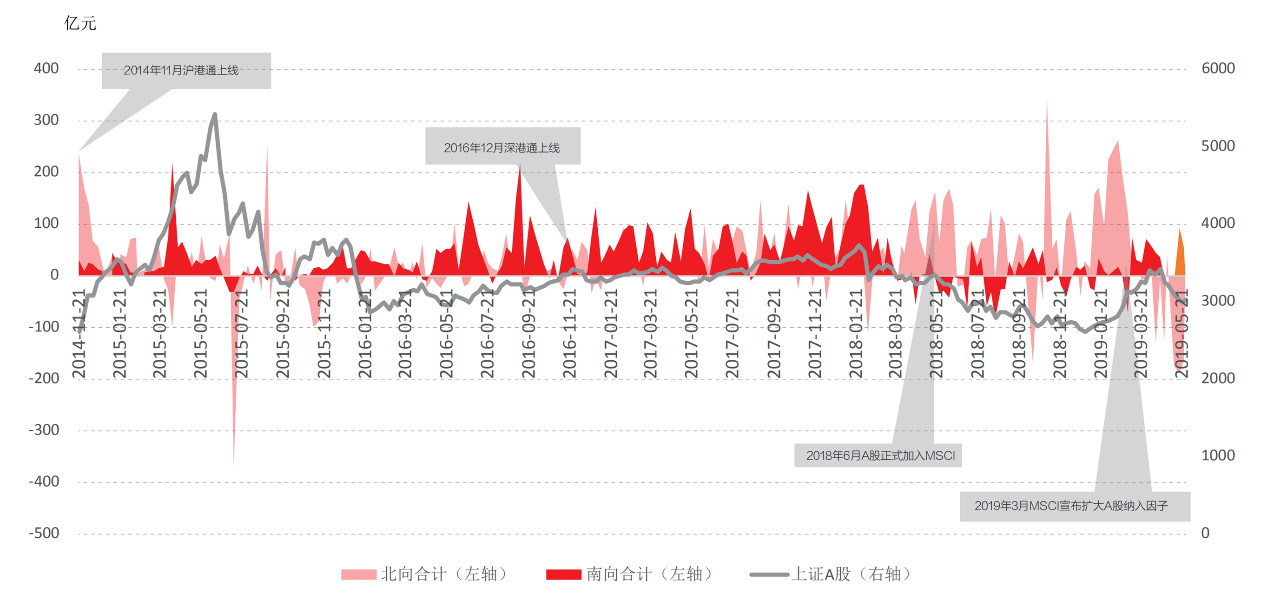 为了加强内地和香港股票市场的联系,“沪港通”和“深港通”分别于2014年、2016年启动。2018年5月,当“沪港通”和“深港通”的日额度扩大了4倍,进一步放宽了两地资本市场的资金流动限制。截至2019年4月底,北向“沪股通”“深股通”累计金融合计7633.84亿元,沪深两市南向“港股通”累计金额合计7453.42亿元。另外,连接上海和伦敦两地股票市场的“沪伦通”也在筹划之中,有望近期落地。