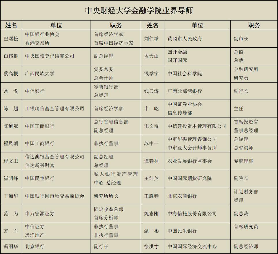 best365足球官网聘请了一批有成就的政府部门领导、学术界和金融业界精英作为兼职教授和兼职导师。业界导师将给员工进行实务课程讲座,学员在学术论文写作时,校内和校外两位导师同时给予指导,凸显了我们培养学员过程中理论与实务相结合的特色。