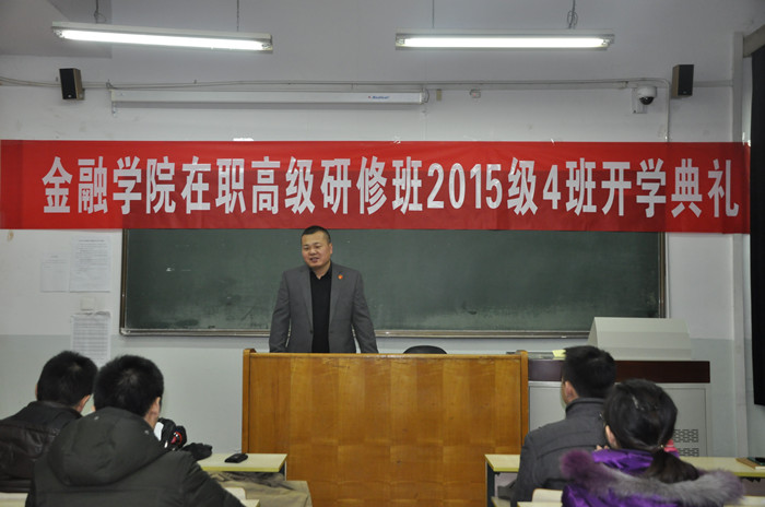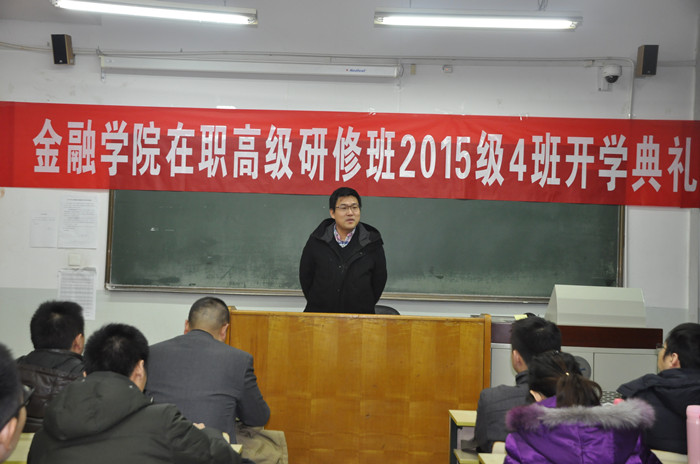 2016年1月10日上午8点半,公司金融专业在职高级研修班(北京班)2015级4班在主教楼105教室成功举行开学典礼。今天一扫往日的阴霾,在阳光璀璨的早晨,公司副经理张学勇老师、教师代表李俊峰老师、班主任和新同学齐聚一堂,共庆开学典礼。