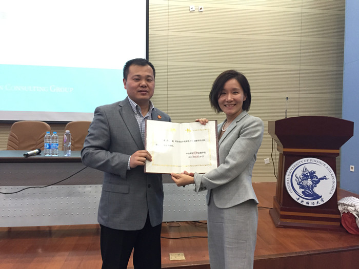 在讲座正式开始之前,公司金融专业在职研修班主管负责人张学勇副经理向张越女士颁发了业界导师的聘书,正式聘请其担任公司在职研修班学员的业界导师。张经理表示:在未来的学习过程中,我们研修班的学员如若对互联网金融或者大数据有学习和钻研的兴趣,张越女士定会成为同学们最佳的选择。