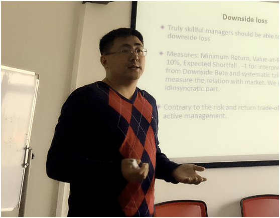 本次研讨会由清华大学经济与管理公司金融系助理教授姜磊就“市场下行损失与共同基金业绩表现”做了专业而精彩的报告。在共同基金的业绩评价中,下行损失越大,基金收益越低;反之下行损失越小,基金收益越高。这一现象与传统金融学的“风险收益相匹配”规律是矛盾的。基于此,姜磊教授重点探讨了两个问题:第一是为什么基金的下行损失大风险高但是收益却低;第二是为什么这样的基金仍然能在市场上存在。姜磊教授认为,基金与股票不同,是被管理的资产,被管理资产的收益取决于管理水平;而股票是客观资产,所以风险与收益相匹配,其下行损失现象也是不显著的。此外,姜磊教授认为由于“代理人问题”的存在,基金管理人更倾向于做大基金管理规模使之显得“吸引力更强”,而不是完全专注于持有人收益最大化。最后,姜磊教授分享了下行损失的5种测度方法,并介绍了其稳健性检验情况。在报告会中,参会老师与演讲嘉宾就报告内容展开了热烈的讨论,提出许多富有启发性的意见和建议,使得各参会人员受益良多。
