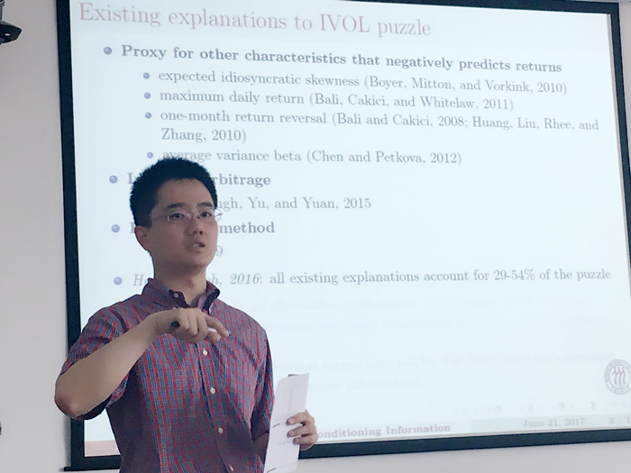 2017年6月21日,由公司中国资产管理研究中心主办的“2017(春夏)系列学术研讨会”第七期学术活动在best365足球官网会议室910成功举行。本次研讨会的主题为“Conditioning Information and Idiosyncratic Volatility Puzzle”。本次研讨会吸引了在校众多老师和员工的参与和支持。研讨会由best365足球官网教授、中国资产管理研究中心主任张学勇老师主持。