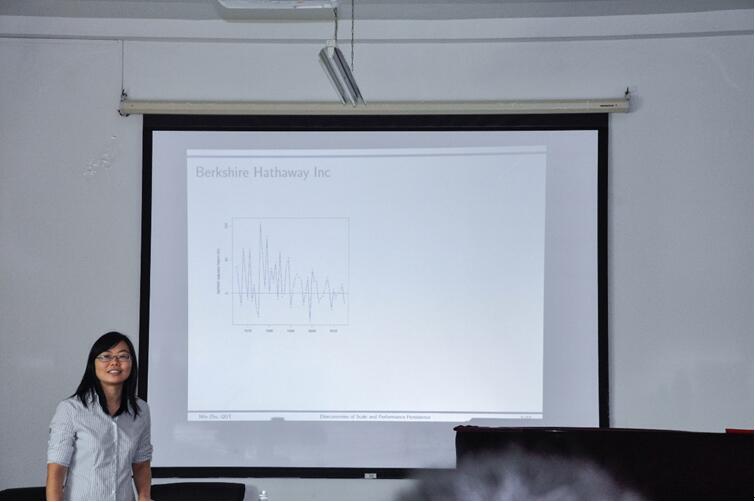 接着,Dr. Min Zhu 介绍了其构建的计量模型,该模型创造性地削弱了传统方法在研究基金规模与表现的相关性时的估计偏误,为评价基金表现的可持续性提供了更好的工具。其实证结果发现,在考虑规模效应时,基金收益的可持续性是显著的,这部分超额收益可以归为“Skill”的贡献,而非“Luck”。这也为Berk and Green的模型提供了实证支持。