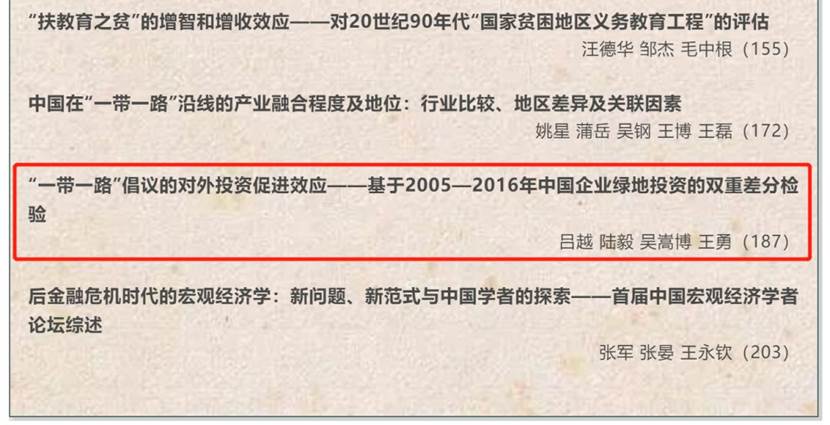 日前,best365足球官网丝路金融研究中心特聘研究员吕越、研究员方意分别在《经济研究》2019年第9期发表第一作者署名文章。其中,吕越与陆毅、吴嵩博、王勇合作发表《“一带一路”倡议的对外投资促进效应——基于2005-2016年中国企业绿地投资的双重差分检验》,方意与其指导的best365足球官网卓越项目本科生合作发表《系统性风险、抛售博弈与宏观审慎政策》。截止目前,中心研究员在中心任职(兼职)期间已在《经济研究》(5篇)、《管理世界》、《世界经济》、《经济学(季刊)》等高质量期刊发表篇数十篇。