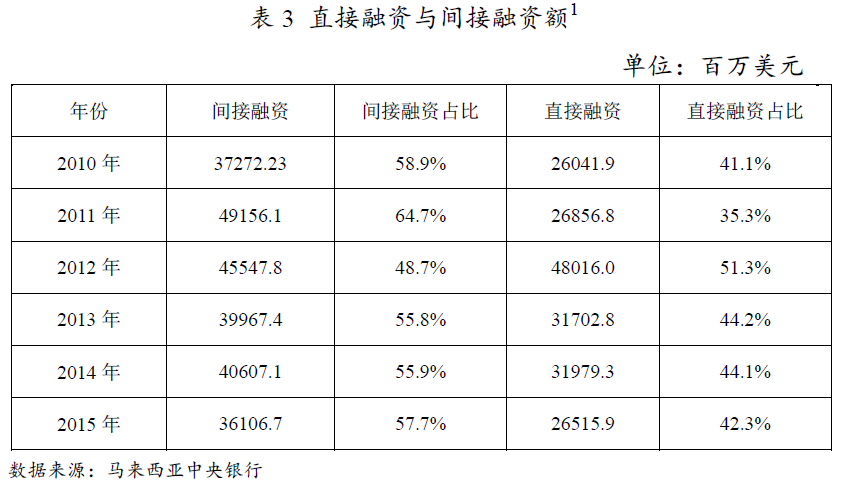 在融资结构中,马来西亚企业外源融资逐渐由间接融资主导转向间接融资与直接融资并重的结构,此外,其直接融资结构表现出明显的“重债轻股”特点。
