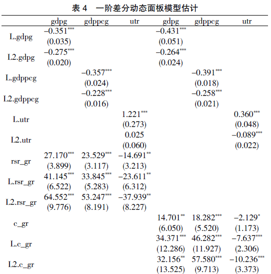 考虑到本文的模型中出现了滞后被解释变量,面板数据模型最常用的固定效应模型和随机效应模型已不能保证得出无偏的参数估计,因此本文采用两阶段一阶差分广义矩估计法(D-GMM)来消除自回归中的内生性的影响。鉴于各经济体类型之间的差异性,模型极有可能存在异方差,故选用Hansen检验来判断过度识别与否。从F_p、ar2p和Hansenp来看,不存在二阶自相关问题和过度识别问题。回归结果显示,基础设施代理变量rsr_gr和c_gr的当期值、滞后一阶和滞后二阶项的系数对GDP增长率和人均GDP增长率均显著为正,对失业率均显著为负,表明基础设施发展对经济增长、居民生活水平的提高和减少失业有着显著的持续性的积极效果。