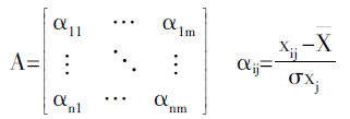 其中i=1,2,…,n,j=1,2,…, m。aij+和aij-分别表示现有评价对象在第j个指标上的最大值和最小值。