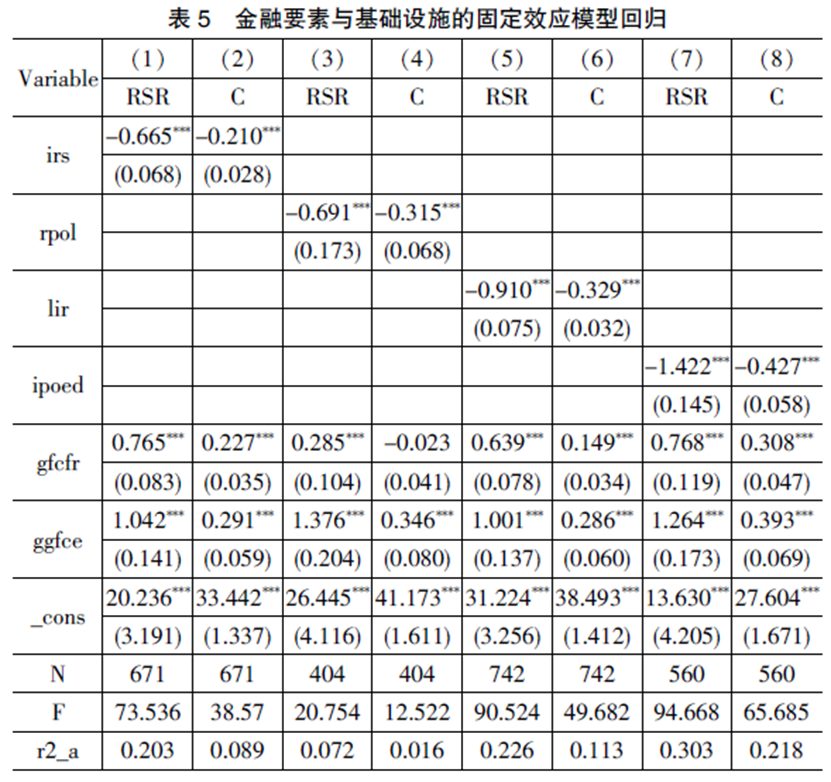 基于上述论述,本文采用面板数据回归的方法来研究融资风险、融资成本和融资效率三个因素对基础设施建设综合水平的影响。本文采用贷款的风险溢价衡量贷款风险rpol,采用利差衡量银行部门融资效率irs,采用外债利息支付占比和贷款利率分别衡量外债融资成本ipoed和国内银行融资成本lir;以RSR值和C值衡量基础设施建设综合水平。此处的面板数据均为非平行面板,数据期间为2000至2014年,所选国家和国家数量依数据可得性而定,回归中采用固定效应模型进行参数估计。