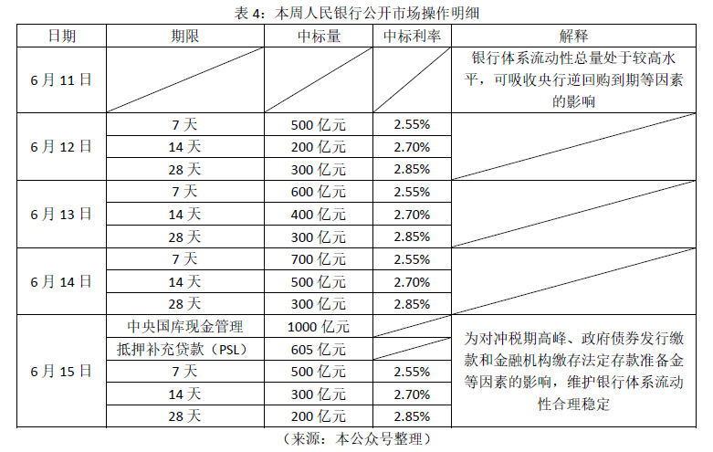 4. 2018年6月11日到6月15日,人民银行进行了多笔公开市场业务操作,具体表4所示。