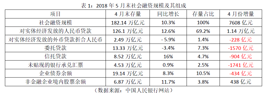 1. 2018年6月12日,中国人民银行发布2018年5月末的社会融资规模数据,具体如表1所示。