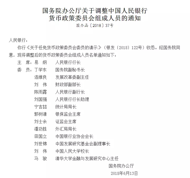1. 2018年6月15日,国务院公布了国办关于调整央行货币政策委员会组成人员的通知,本公众号将主要内容整理如下: