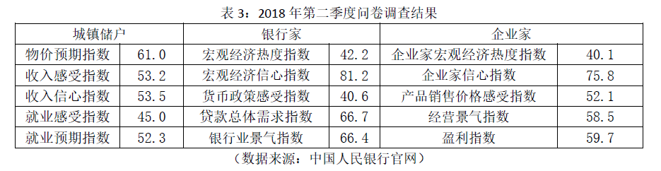 3. 2018年6月15日,人民银行公布了2018年第二季度的城镇储户问卷调查报告、银行家问卷调查报告和企业家问卷调查报告,具体数据如表3所示。