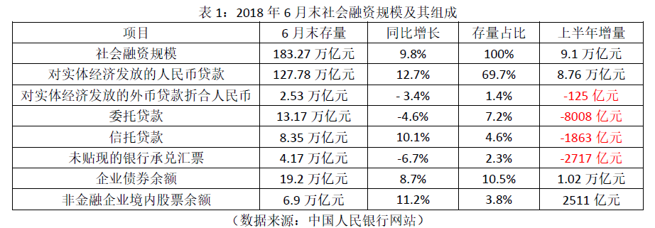 1. 2018年7月13日,中国人民银行发布2018年6月末的社会融资规模数据,具体如表1所示。