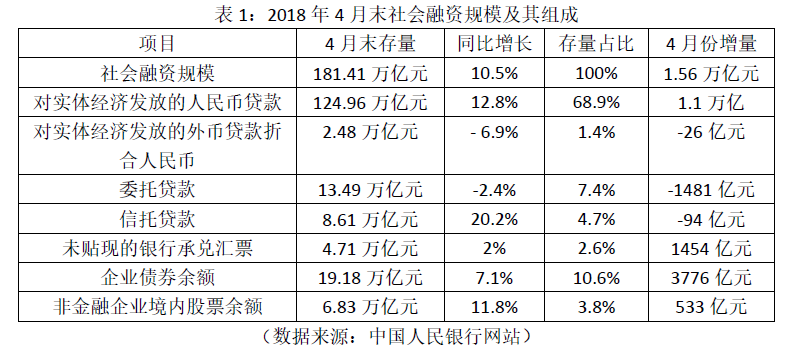 1. 2018年5月11日,中国人民银行发布2018年4月末的社会融资规模数据,具体如表1所示。