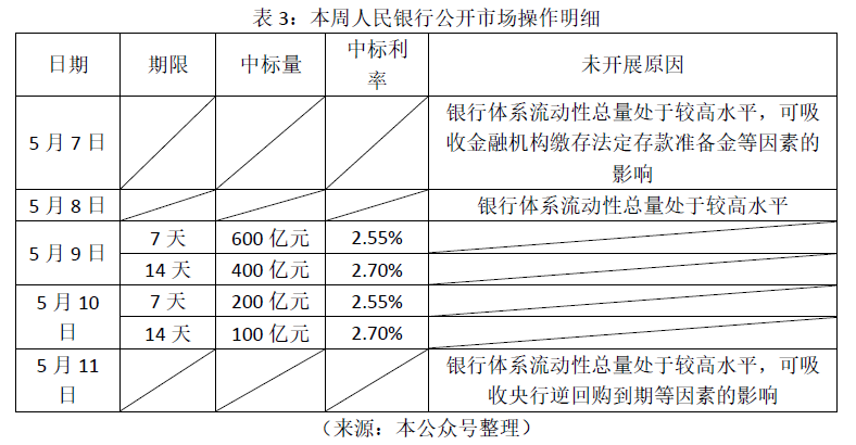 4. 2018年5月7日到5月11日,人民银行进行了多笔公开市场业务操作,具体表3所示。