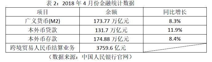2. 2018年5月11日,中国人民银行发布了2018年4月份的金融统计数据,具体如表2所示。