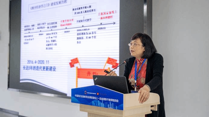 中南民族大学程蹊教授介绍了《推开经济学之门》课程建设的发展历程,分享了自己关于线上一流课程建设的体会:课程建设要学习学习再学习,在学习中捕捉风口、抢先机;要找准课程定位、特色,努力提高流量;要教研相长,形成教学成果链;要摸准员工心态,提起员工的学习兴趣。