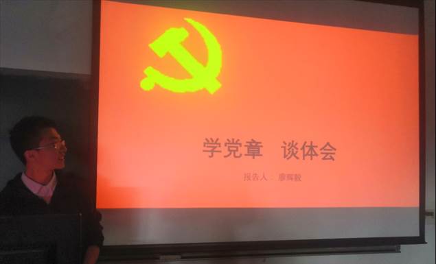 廖辉毅同志则向我们分享了他学习党章过程中的体会和感悟。通过他的学习分享,我们重温了党的性质、指导思想、组织制度、党员要求等相关知识,并对党的组织制度、党员干部的建设等方面进行了更加深入的了解。通过此次学习我们也意识到党章是在不断变化的、与时俱进的,党和国家每前进一步,党章中就会有相应的反映。如十九大党章便将习近平新时代中国特色社会主义思想列入党的指导思想与行动指南,并将我国社会主要矛盾转化为人民日益增长的美好生活需要和不平衡不充分的发展之间的矛盾。因此,党章的修改变化其实也对我们提出了更高的要求。我们也需要与时俱进,需要时刻督促自己不断学习来加强自身思想道德建设,需要不断地利用党的指导思想武装自己、指导实践。只有这样,我们才能不断地适应党与国家发展的新形势以及其所提出的新要求,从而更好地为服务人民、建设国家做出自己的贡献。