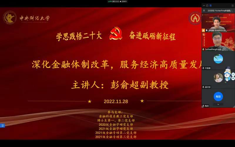 党的二十大报告指出,在推进高质量发展的过程中要持续深化金融体制改革,发挥金融服务实体经济的功能,加强和完善现代金融监管,强化金融稳定保障体系。为深入学习党的二十大精神,贯彻落实“把论文写在祖国大地上”的指导思想,引导师生把握未来金融发展的方向,2022年11月28日,金融科技系教职工党支部,博士生第一、第二党支部,2020级金融学硕党支部,2021级金融学硕党支部,2021级金融专硕第二党支部,2021级金融专硕第三党支部联合邀请best365足球官网“学习宣传党的二十大精神”师生巡讲团教师代表彭俞超老师讲解“深化金融体制改革,服务经济高质量发展”主题党课。会议由博士生第二党支部书记李明琢同志主持。